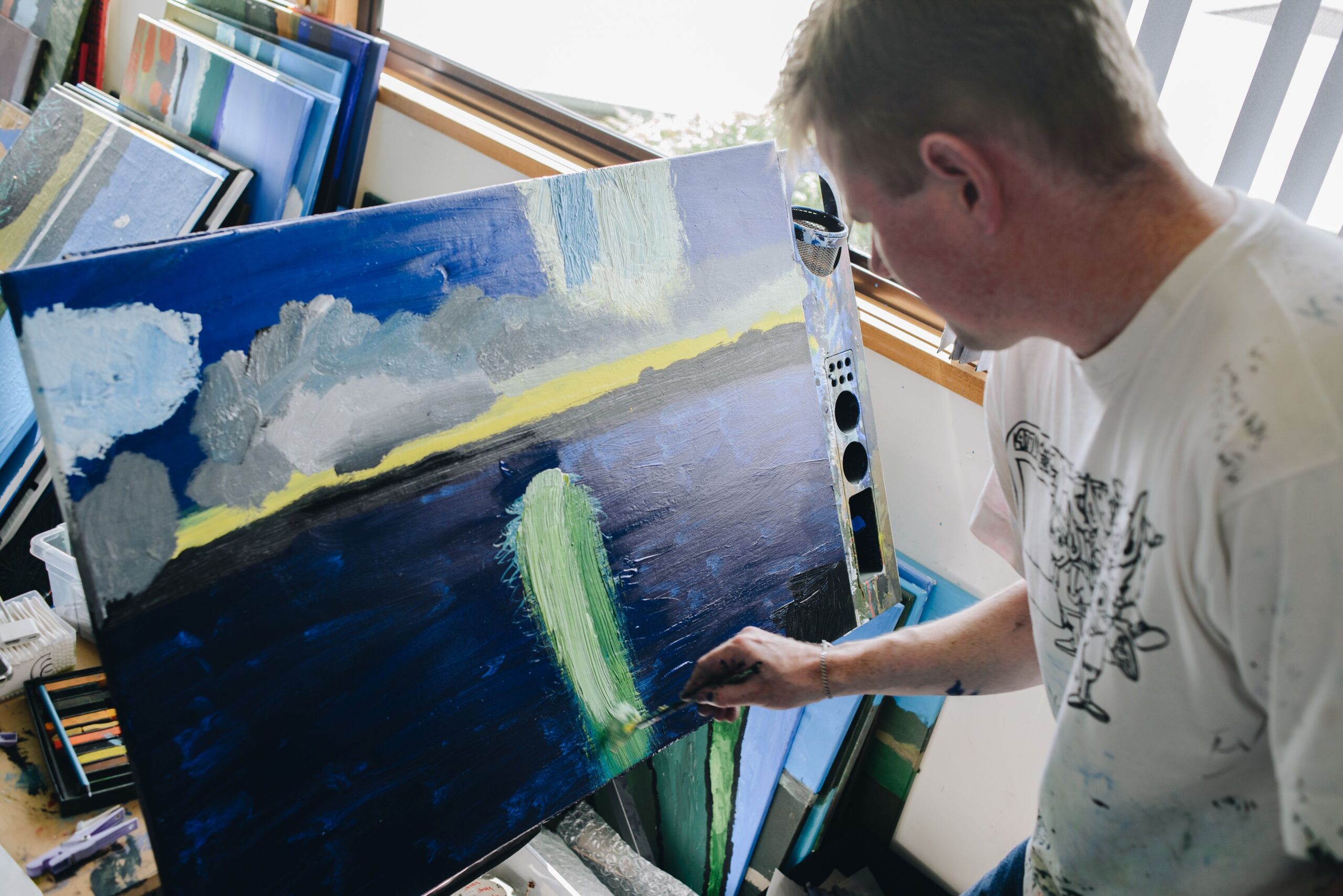 Michael McQuillan painting in his home studio during a Satellite Arts session.