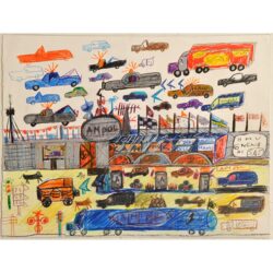 Steven Perrette (b 1969, Melbourne) is a mid-career artist whose small and mid-scale works on paper frequently depict frenetic workings of the western world. Throughout his career, he has maintained a fascination with industrial and vintage ships and sailing boats as well as country roads and highways that he travelled with his father when he was a young child. Perrette has worked at Arts Project since 2000 and had his first solo exhibition in 2011. He has exhibited in numerous group shows and has work in the National Gallery of Australia, City of Moreland and V-Line collections.