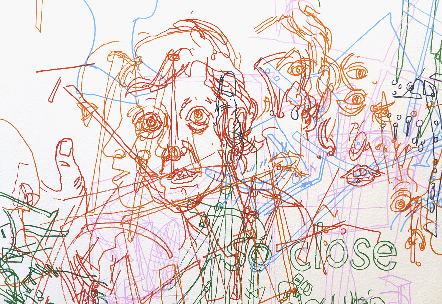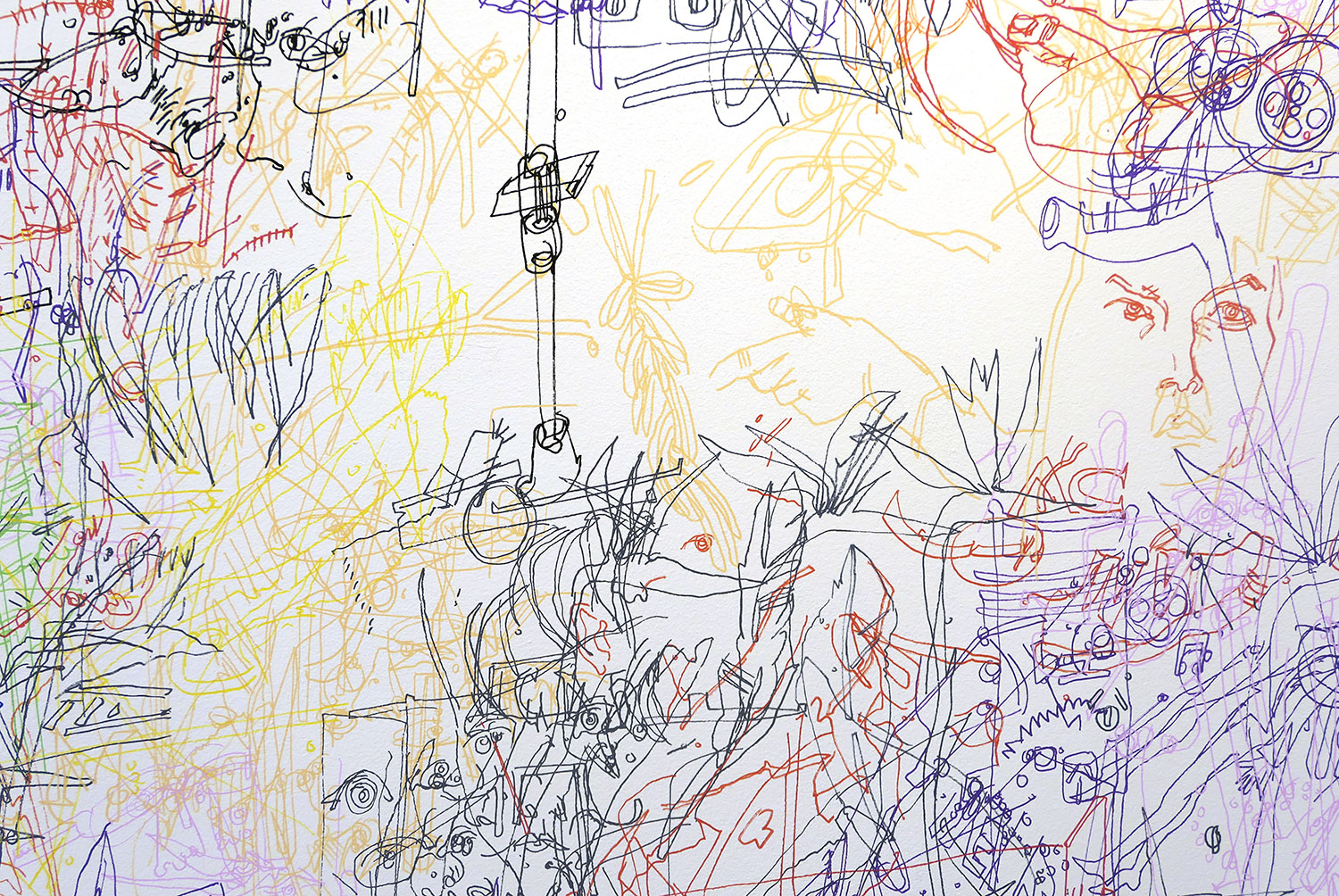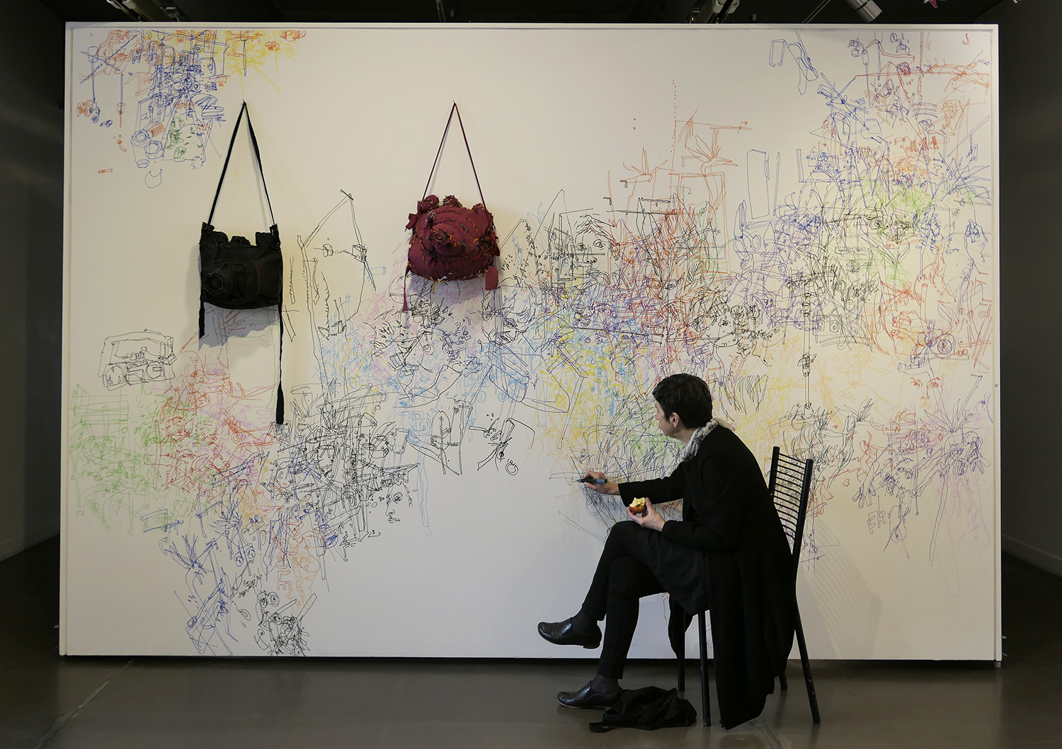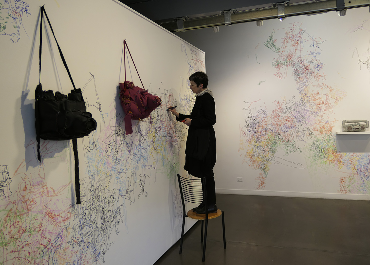Working with pigment marker, Wlodarczak’s drawing are negotiated via a physical and mental attunement to her surroundings. As the artist says of her process in Artist Profile, “All people and objects by being present in a particular space at the particular moment in time exchange energy and establish a state of in-betweenness – a shared space, which builds something else, a membrane, which holds all the activities within this moment.”