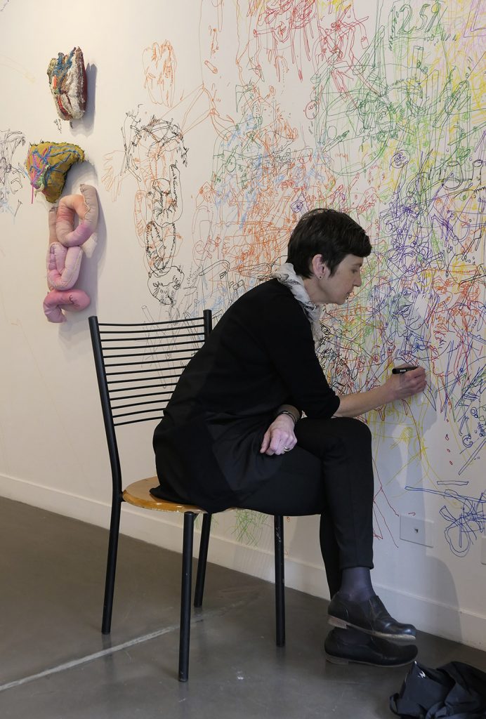 As part of Faraway, so close (launching this Saturday 4 November from 3-5pm), artist Gosia Wlodarczak worked at Arts Project Australia daily, drawing upon the gallery walls for her latest site-specific installation. As curator Anthony Fitzpatrick writes of Wlodarczak’s practice, “In her ongoing series of durational performance drawings called The Rooms, Gosia Wlodarczak generates individual, large-scale and immersive installations which speak to the internal life of the body and, in particular, its organs.”