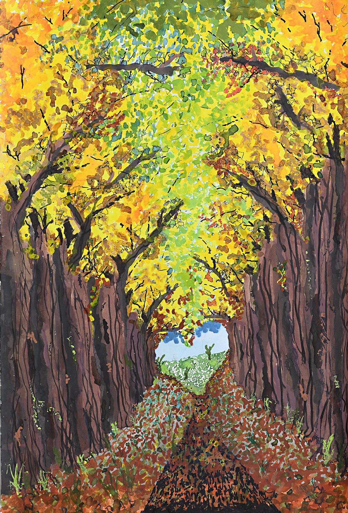 I did the trunk of the trees first, then the leaves and then the branches and then the leaves again. I didn’t know there would be a heart shape until the end – it just happened. I worked from memory because I ride my bike through there most days (but with the coronavirus, only weekends). The leaves at the trunk of the trees are different colours from up high- that made a big difference. I like how the perspective points to the heart shape. You travel along to the love at the end.